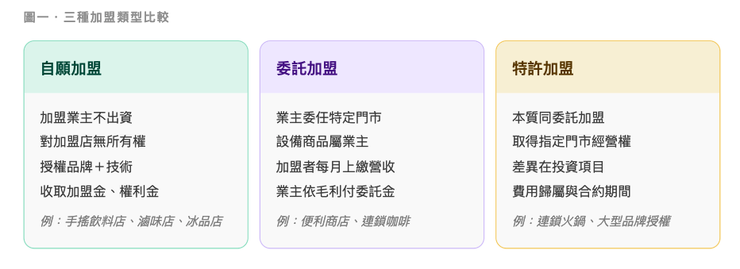 特許加盟本質上與委託加盟類似,差異主要在投資項目、費用歸屬與合約期間的安排。