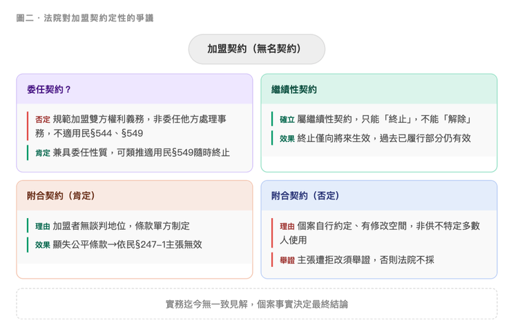 否定派認為,加盟契約的核心是「取得一段期間內的經營資格」,而委任是「一方委託他方處理事務」,本質不同,不能適用或類推適用委任的規定。最高法院 109 年台上字第 2062 號判決就明確指出,加盟契約是規範加盟雙方權利義務的無名契約,而非委任契約。