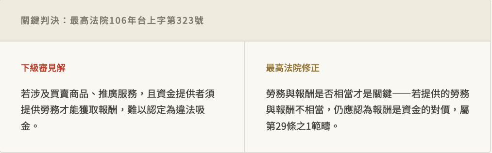 - 第三層:第29條之1的「擬制條款」:就算你換個名目,以借款、收受投資、使加入為股東等方式向多數人收資金,只要約定或給付「與本金顯不相當之報酬」,一樣以收受存款論。